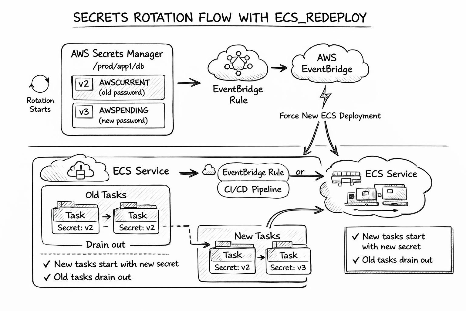 For ECS specifically, be careful with the common pattern of injecting secrets as environment variables in the task definition. AWS notes that if a secret is injected as an environment variable, a running container does not automatically receive the updated value after rotation; you must launch a new task or force a new deployment so the fresh value is picked up.