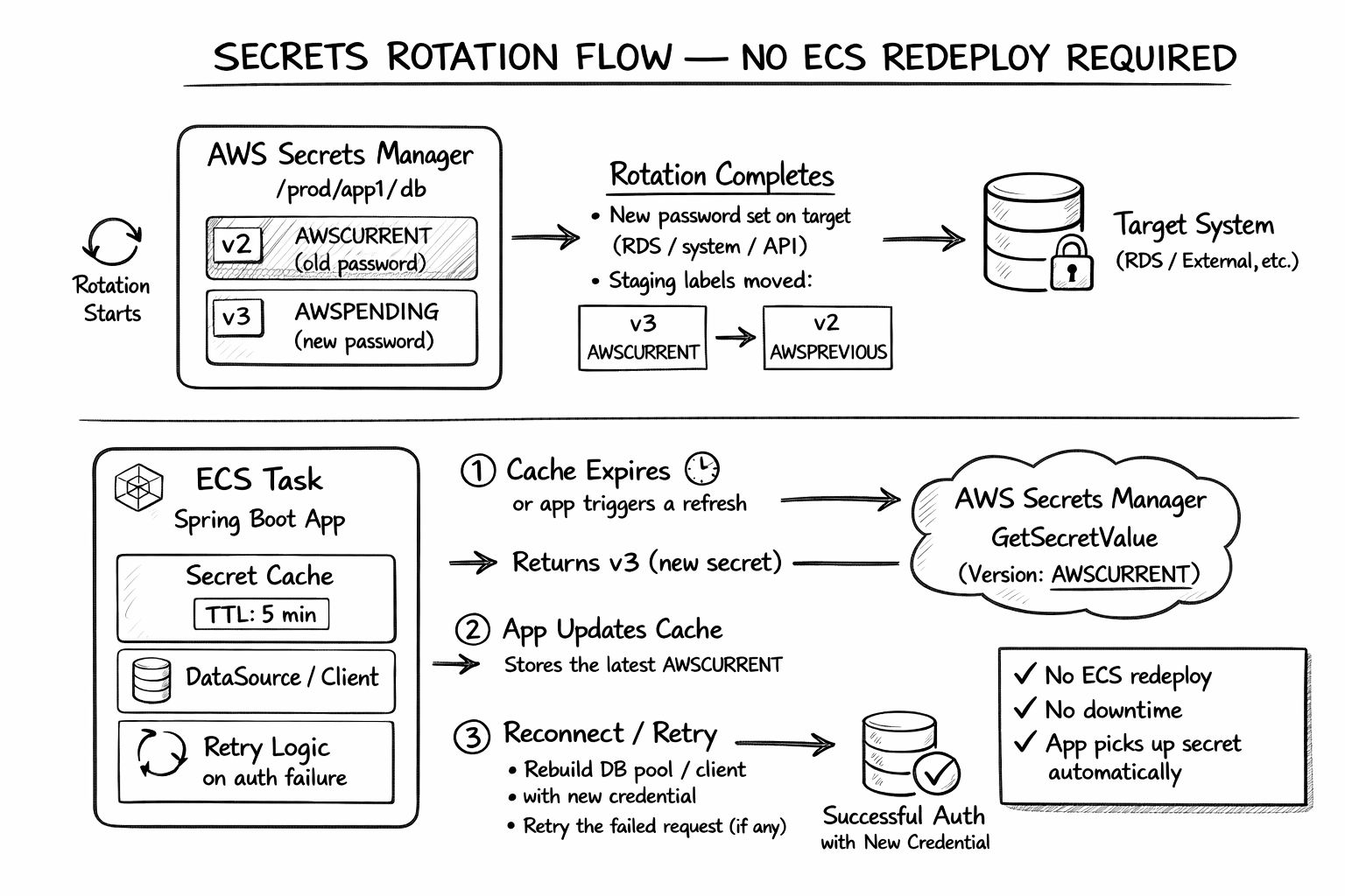 This is better for APIs and system accounts that rotate regularly. The application or a sidecar/agent fetches the current value from Secrets Manager using the task role. With this model, the app can refresh credentials on a timer, on auth failure, or through a small cache TTL. That avoids tying every rotation to an ECS redeploy. AWS recommends caching and supports this pattern through its SDKs and the Secrets Manager Agent